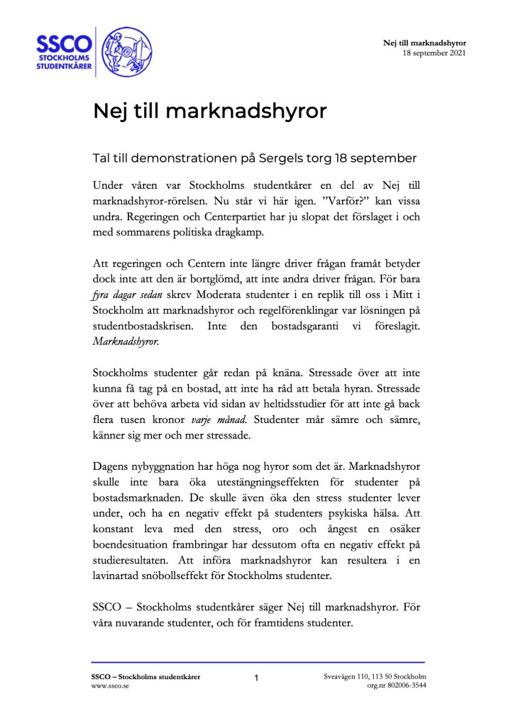 Som alla vi som samlats här idag vet är bostadssituationen i Sverige idag en svår en, inte minst för oss unga. Den genomsnittliga kötiden i Stockholm för en förstahands hyresrätt har ökat oavbrutet de senaste åren. 2019 var kötiden tio år vilket innebär att hade man stått i kön sedan dagen man fyllt 18 hade man varit 28 år när man kunnat flytta hemifrån. Samtidigt är det inte ovanligt för de som studerar att betala mellan hälften och två tredjedelar av studiemedlen för en studentlägenhet där vardagsrummet, sovrummet och köket är desamma. För vissa av oss kan detta ändå te sig som rena lyxen.