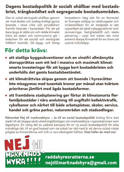 – Hyrorna är redan för dyra. Hyreskamp mot höjda och marknadsanpassade hyror.