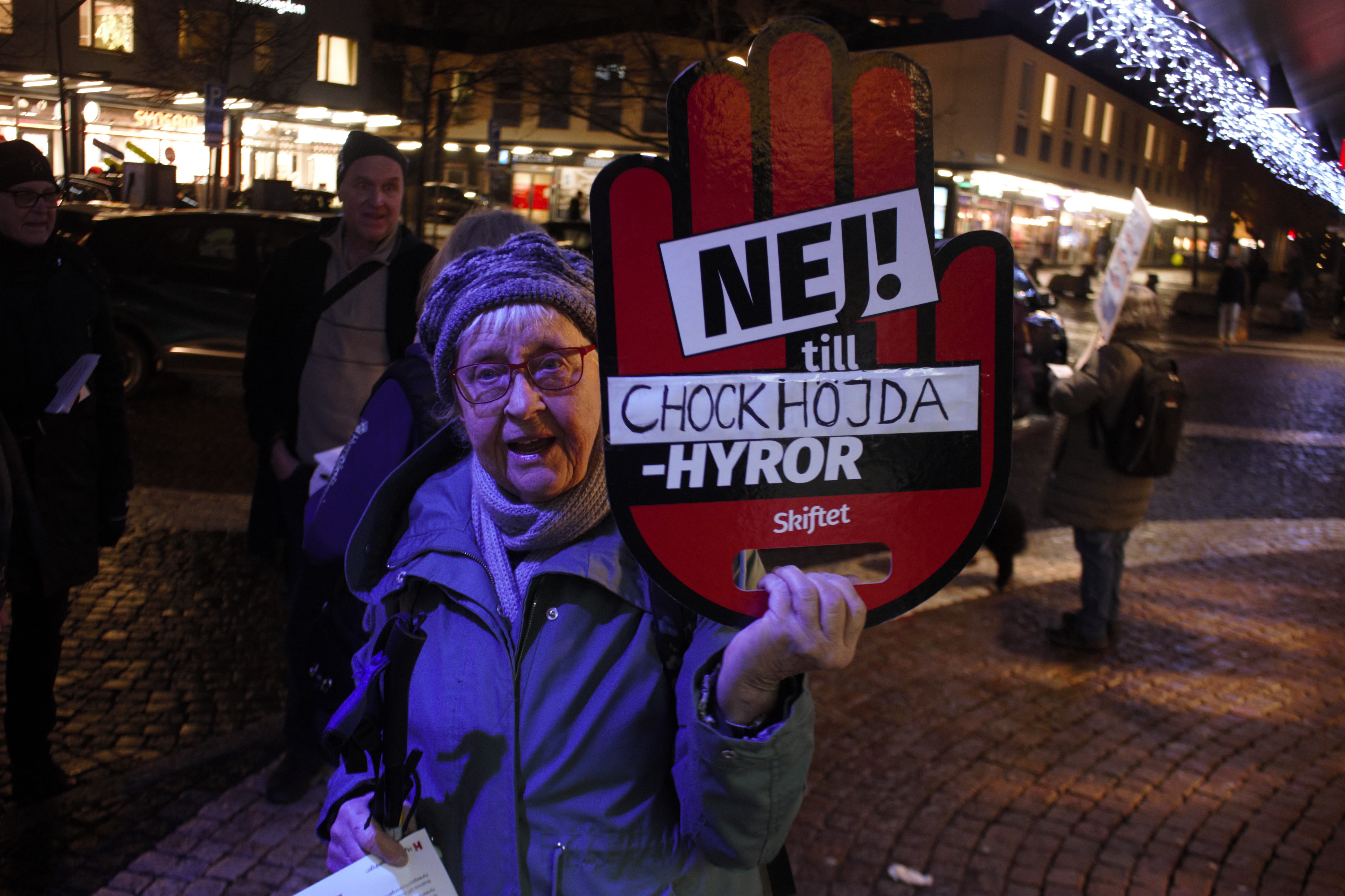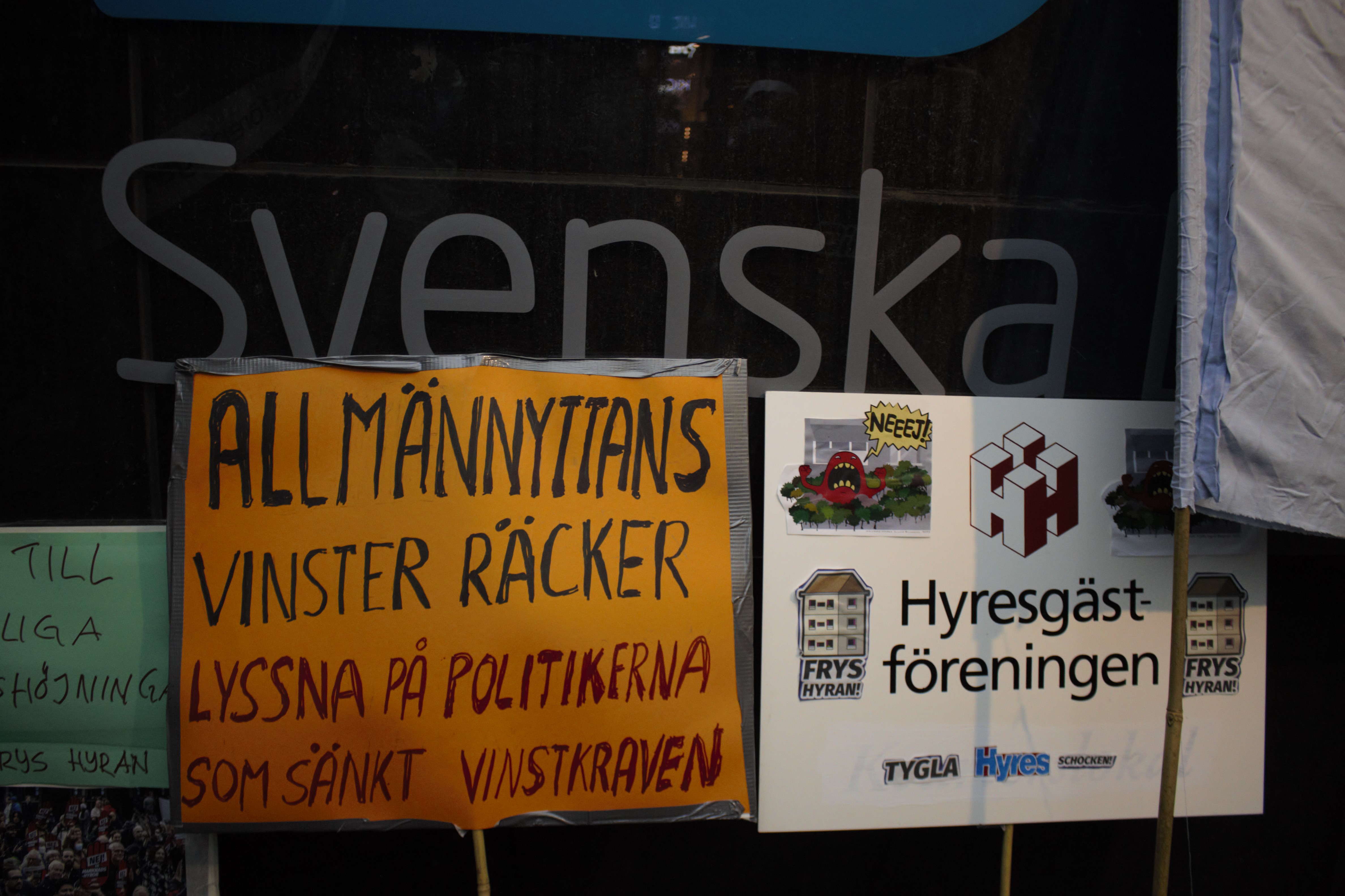 Den 9 januari demonstrerade hyresgäster utanför Stockholmshem, Svenskabostäder och Familjebostäders kontor för att trycka på i förhandlingsprocessen om årets hyror. Det oförskämda kravet på 8,7 procents hyreshöjningar har fått Stockholmarna att koka och Hyresgästföreningen hade kallat på protesterna. Nätverket Nej till marknadshyra Ja till en social bostadspolitik backade upp med mobilisering, tal, banderoller, megafoner och krav på frysta hyror.